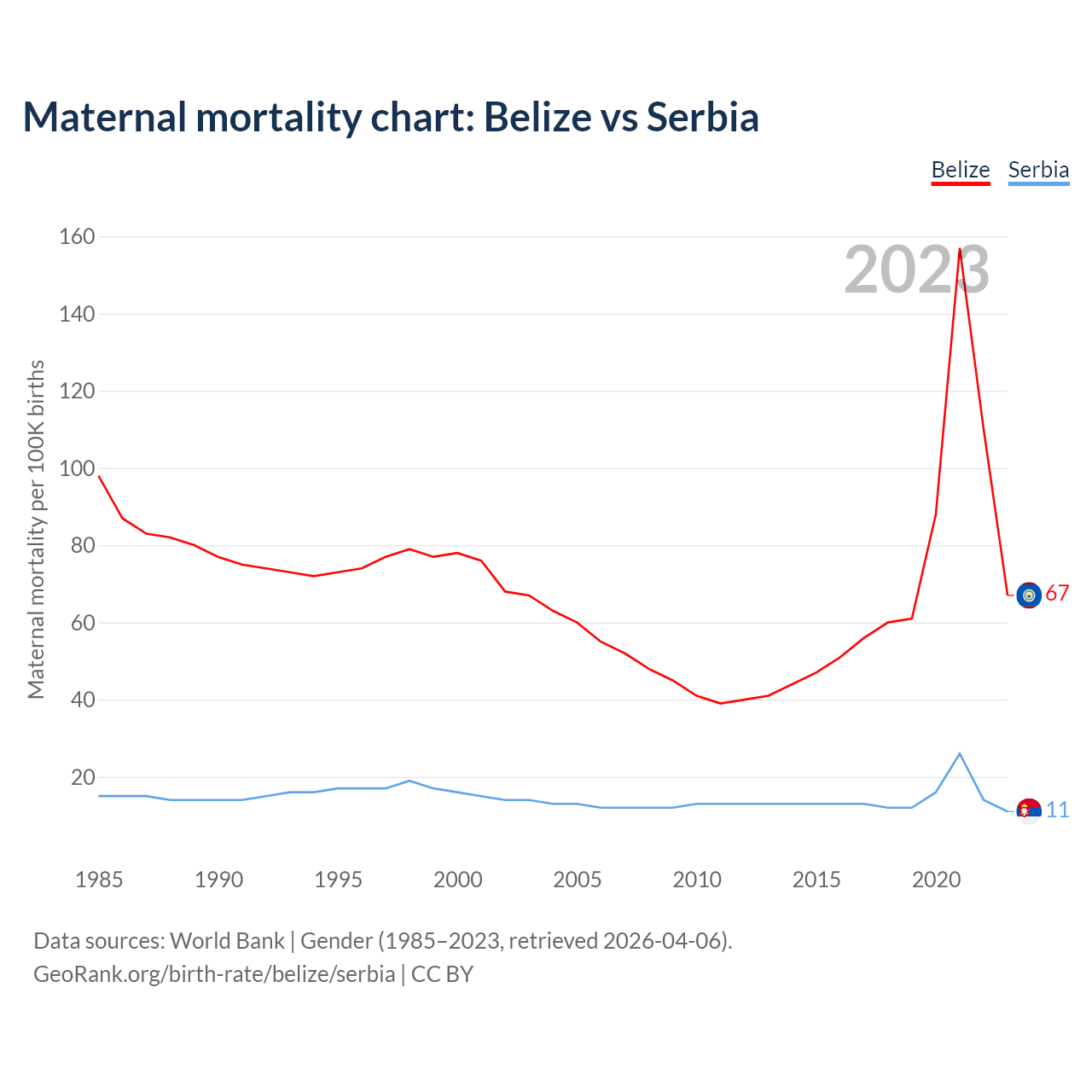 The maternal mortality rate, which is the probability of dying during childbirth or within 42 days of pregnancy termination, is 67 deaths per 100,000 live births in Belize, compared to 11 deaths in Serbia.