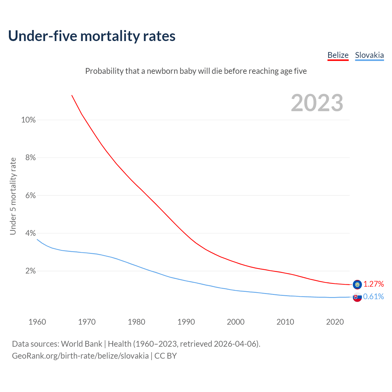 The chance that a newborn baby will die before reaching age five is 1.27% in Belize and 0.61% in Slovakia. Above is a chart with historical data on under-five mortality rates.
