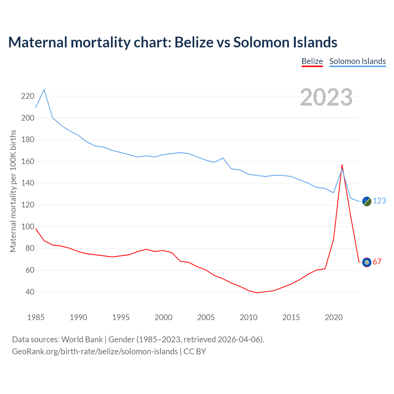 The maternal mortality rate, which is the probability of dying during childbirth or within 42 days of pregnancy termination, is 67 deaths per 100,000 live births in Belize, compared to 123 deaths in the Solomon Islands.