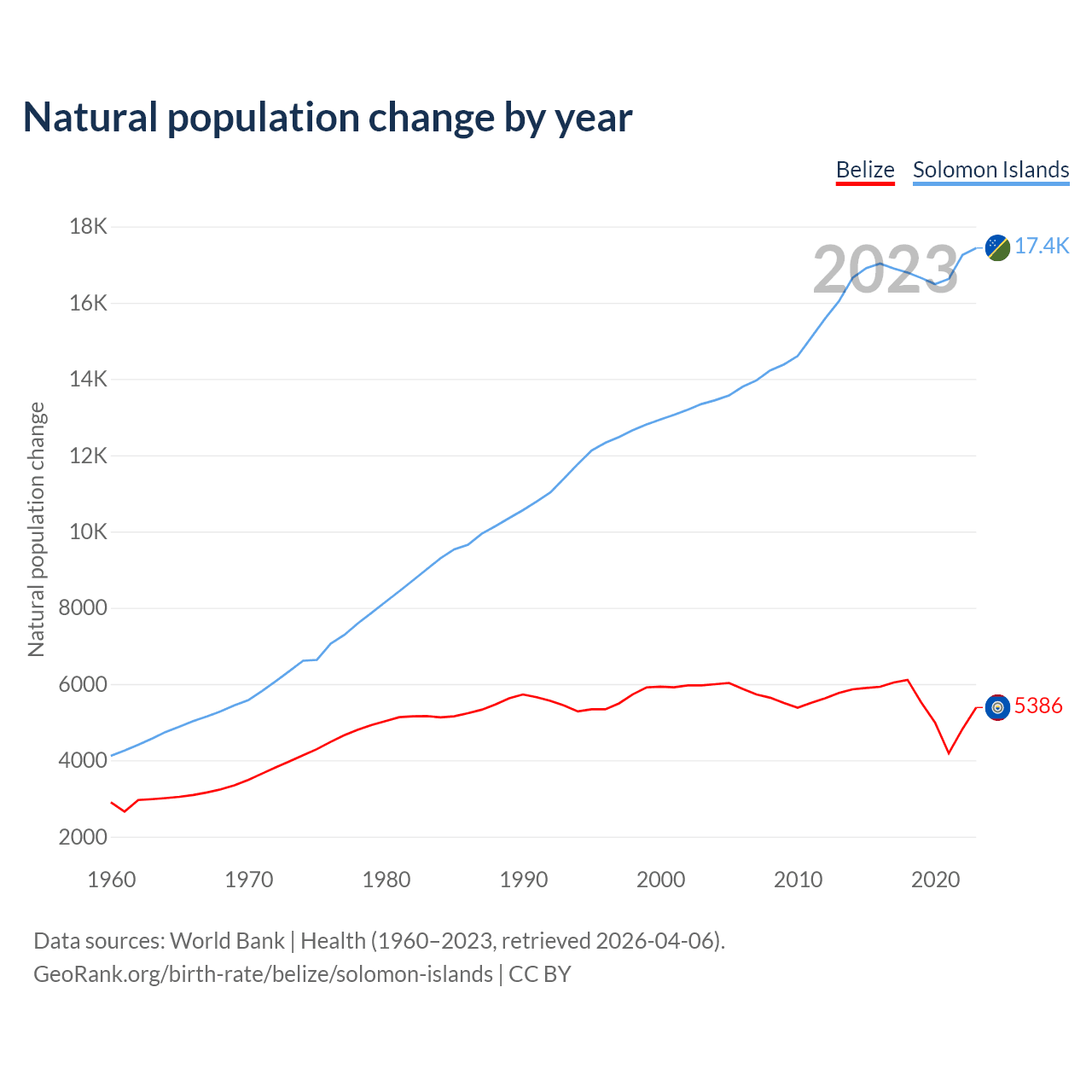 Belize has an annual birth rate of 18 births per 1,000 people, compared to 26.9 for the Solomon Islands. The average number of children a woman is expected to have during her lifetime — the fertility rate, is 2.01 in Belize and 3.56 in the Solomon Islands — 77.2% difference.