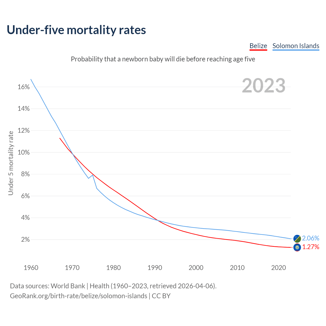 The chance that a newborn baby will die before reaching age five is 1.27% in Belize and 2.06% in the Solomon Islands. Above is a chart with historical data on under-five mortality rates.