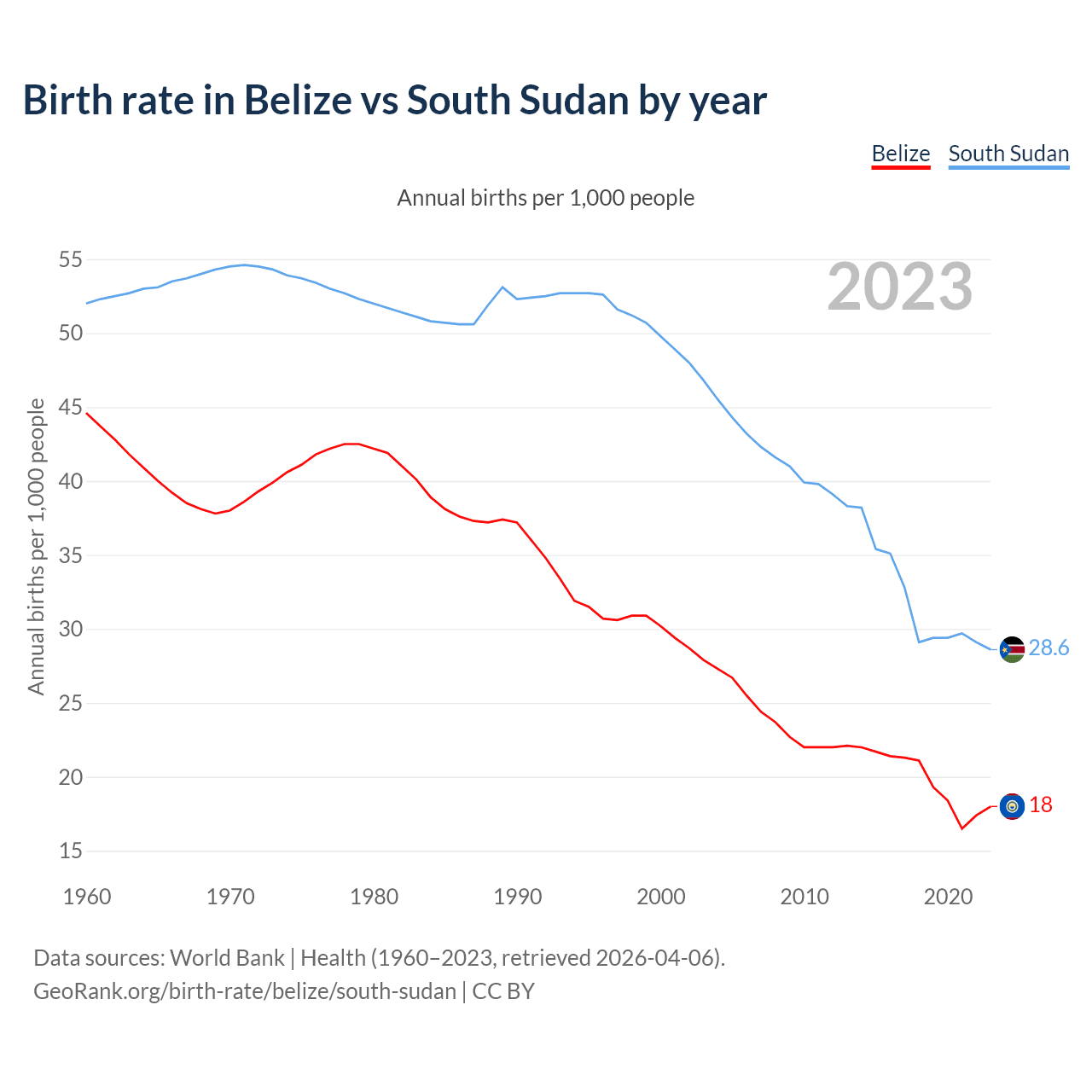 Belize has an annual birth rate of 18 births per 1,000 people, compared to 28.6 for South Sudan. The average number of children a woman is expected to have during her lifetime — the fertility rate, is 2.01 in Belize and 3.86 in South Sudan — 92.5% difference.