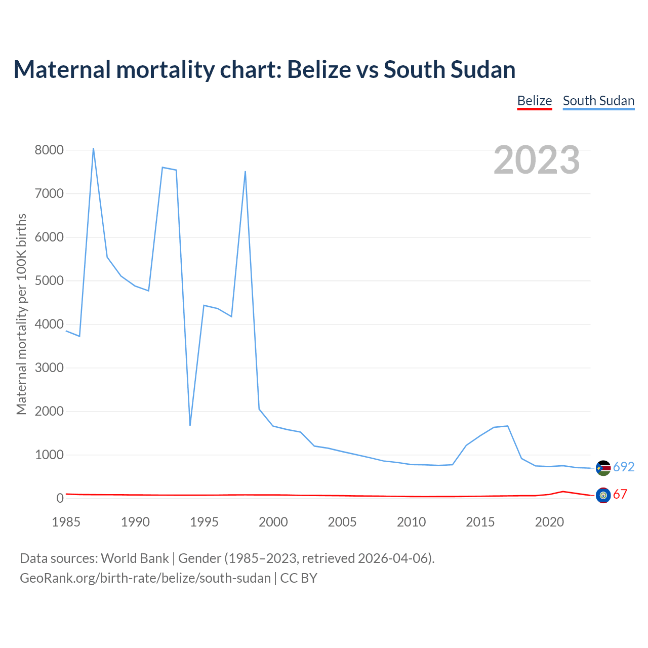 The maternal mortality rate, which is the probability of dying during childbirth or within 42 days of pregnancy termination, is 67 deaths per 100,000 live births in Belize, compared to 692 deaths in South Sudan.