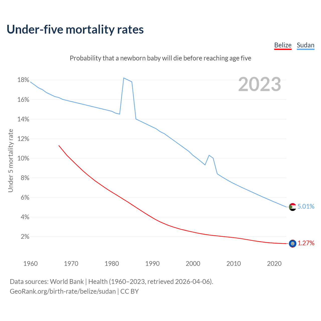 The chance that a newborn baby will die before reaching age five is 1.27% in Belize and 5.01% in Sudan. Above is a chart with historical data on under-five mortality rates.
