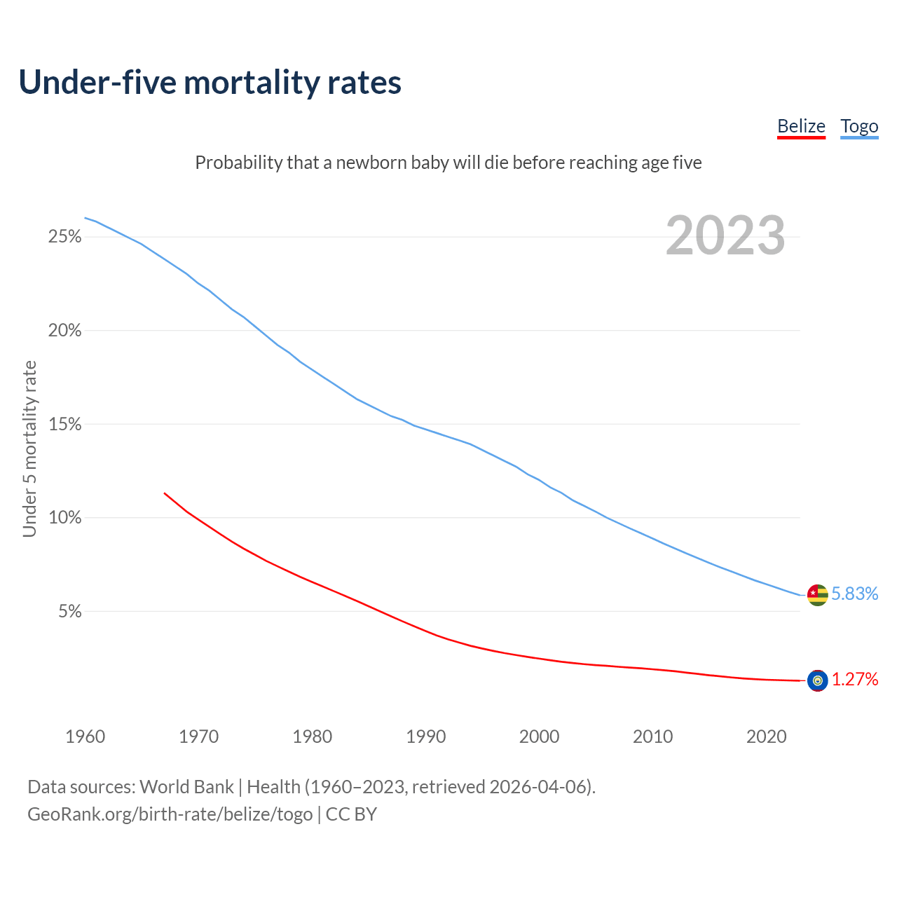 The chance that a newborn baby will die before reaching age five is 1.27% in Belize and 5.83% in Togo. Above is a chart with historical data on under-five mortality rates.