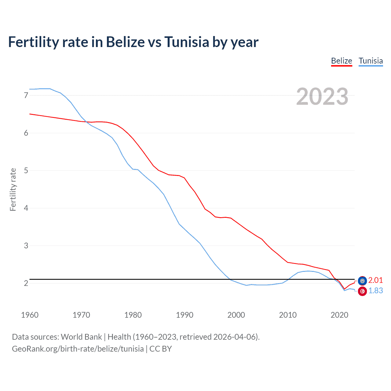 According to the latest available data on birth rates, the fertility rate in Belize was 2.01 children per woman in 2023, compared to 1.83 in Tunisia in 2023. The replacement level is considered to be 2.1 children per woman.