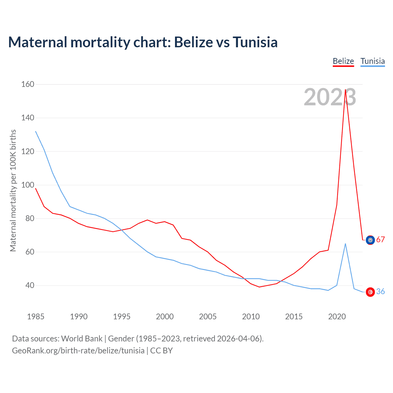 The maternal mortality rate, which is the probability of dying during childbirth or within 42 days of pregnancy termination, is 67 deaths per 100,000 live births in Belize, compared to 36 deaths in Tunisia.
