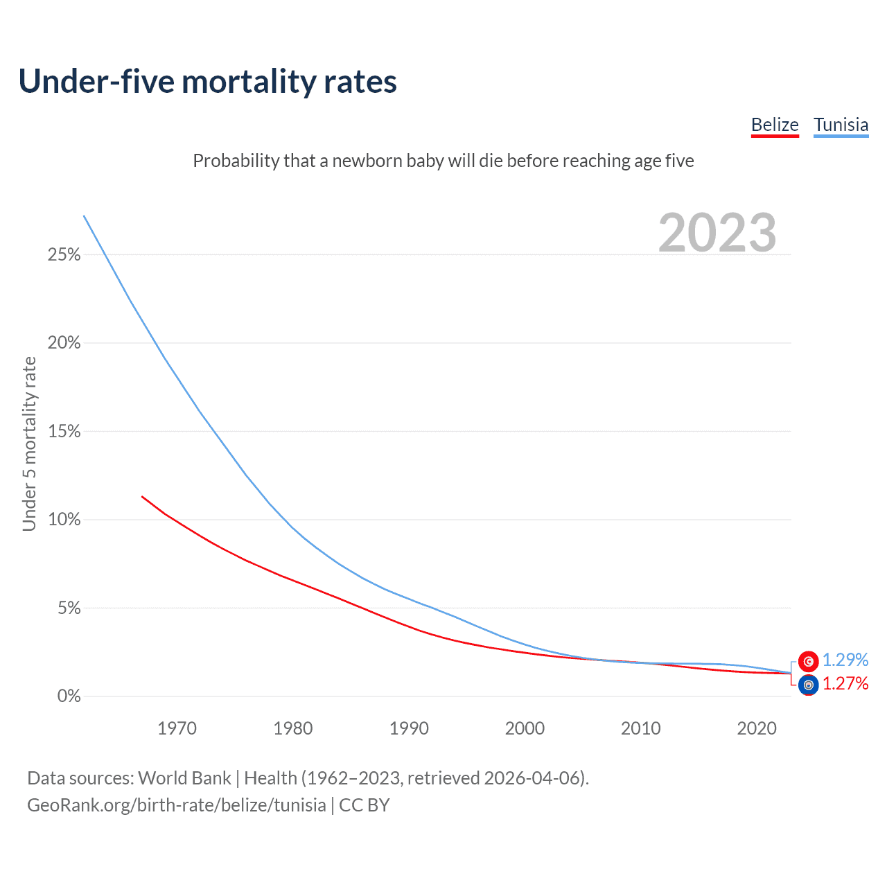 The chance that a newborn baby will die before reaching age five is 1.27% in Belize and 1.29% in Tunisia. Above is a chart with historical data on under-five mortality rates.