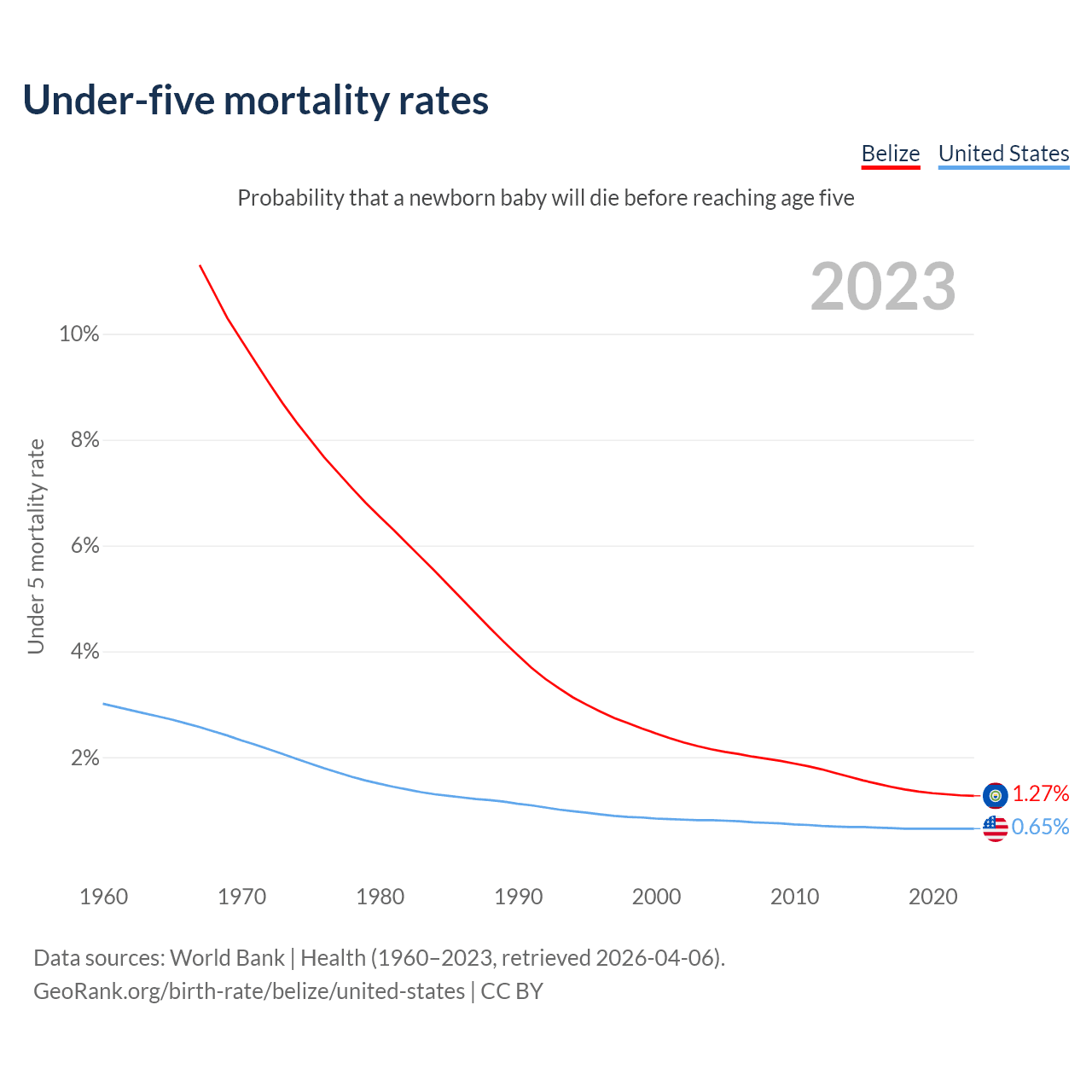 The chance that a newborn baby will die before reaching age five is 1.27% in Belize and 0.65% in the United States. Above is a chart with historical data on under-five mortality rates.