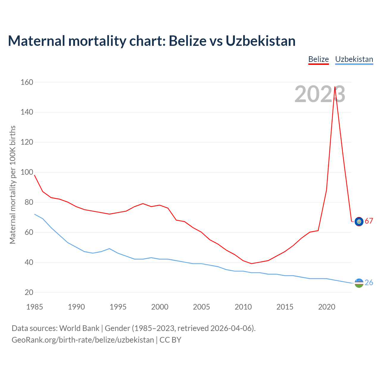 The maternal mortality rate, which is the probability of dying during childbirth or within 42 days of pregnancy termination, is 67 deaths per 100,000 live births in Belize, compared to 26 deaths in Uzbekistan.