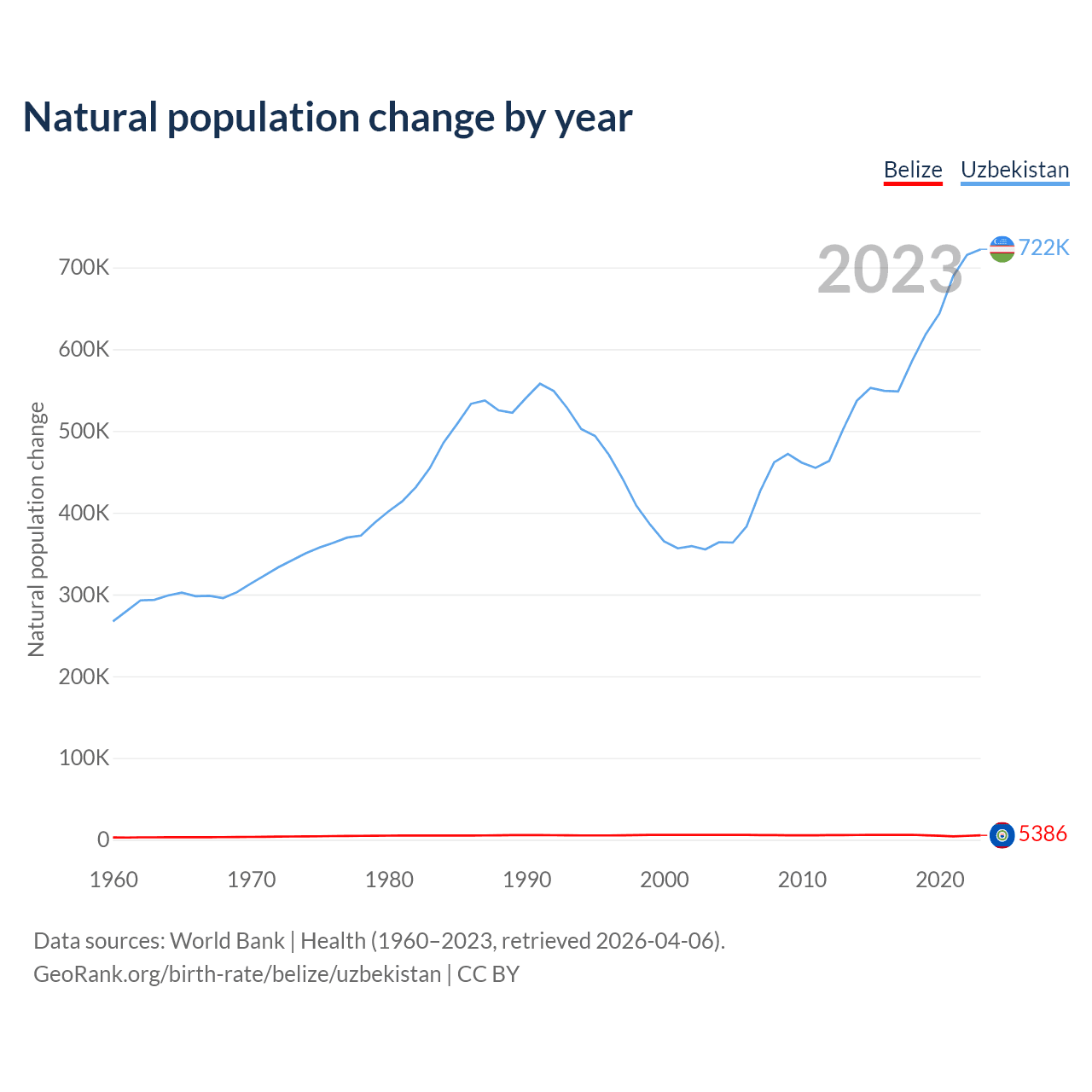 According to the latest available data on birth rates, the fertility rate in Belize was 2.01 children per woman in 2023, compared to 3.5 in Uzbekistan in 2023. The replacement level is considered to be 2.1 children per woman.