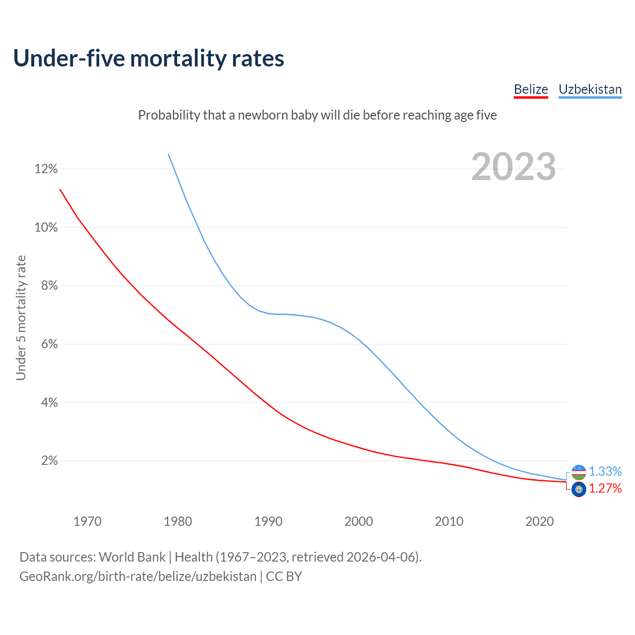 The chance that a newborn baby will die before reaching age five is 1.27% in Belize and 1.33% in Uzbekistan. Above is a chart with historical data on under-five mortality rates.