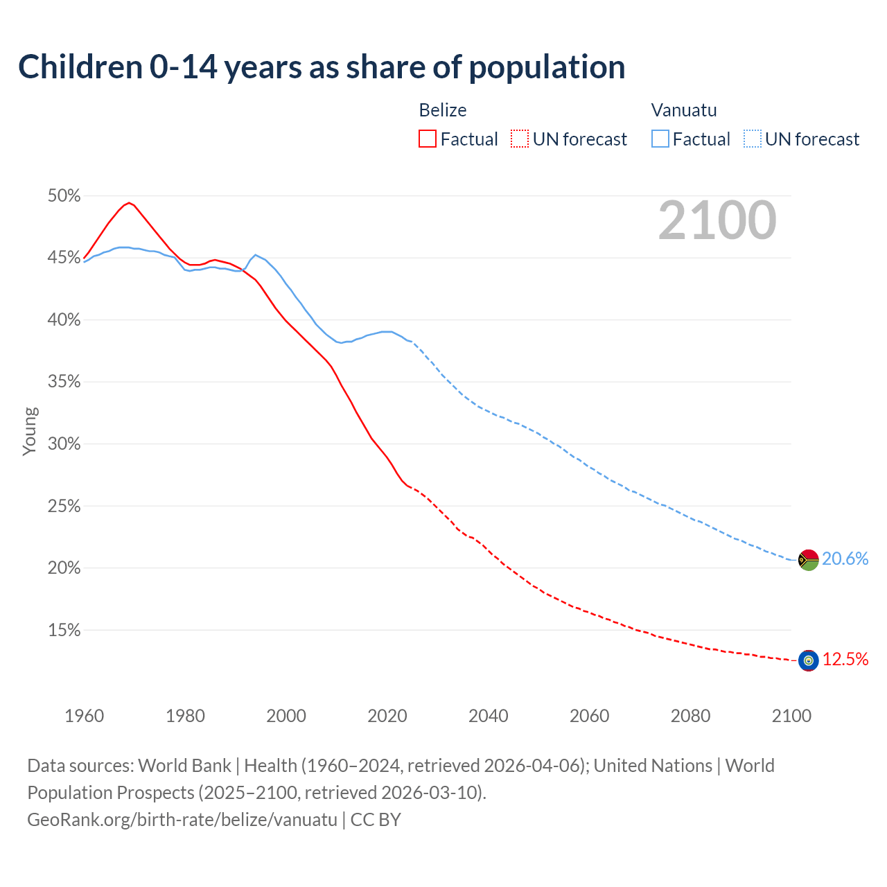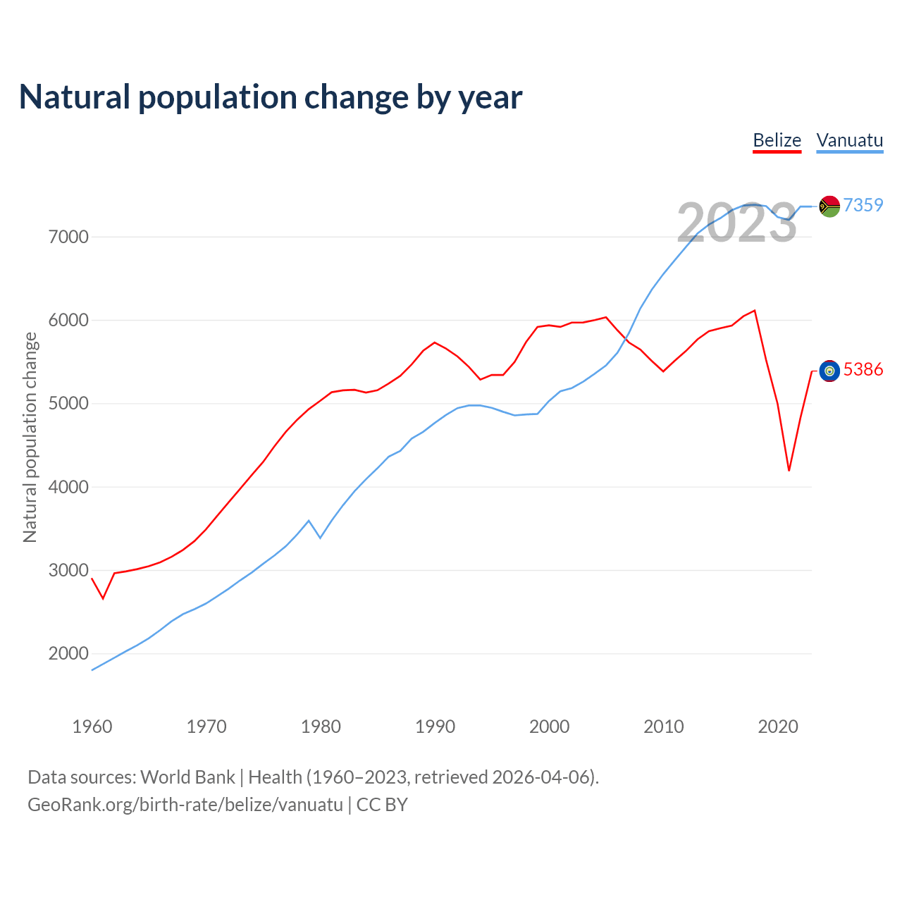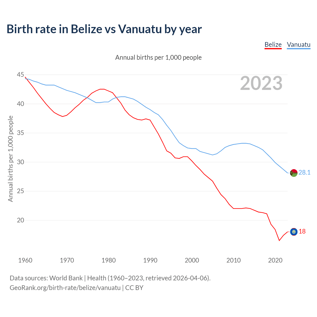 According to the latest available data on birth rates, the fertility rate in Belize was 2.01 children per woman in 2023, compared to 3.6 in Vanuatu in 2023. The replacement level is considered to be 2.1 children per woman.