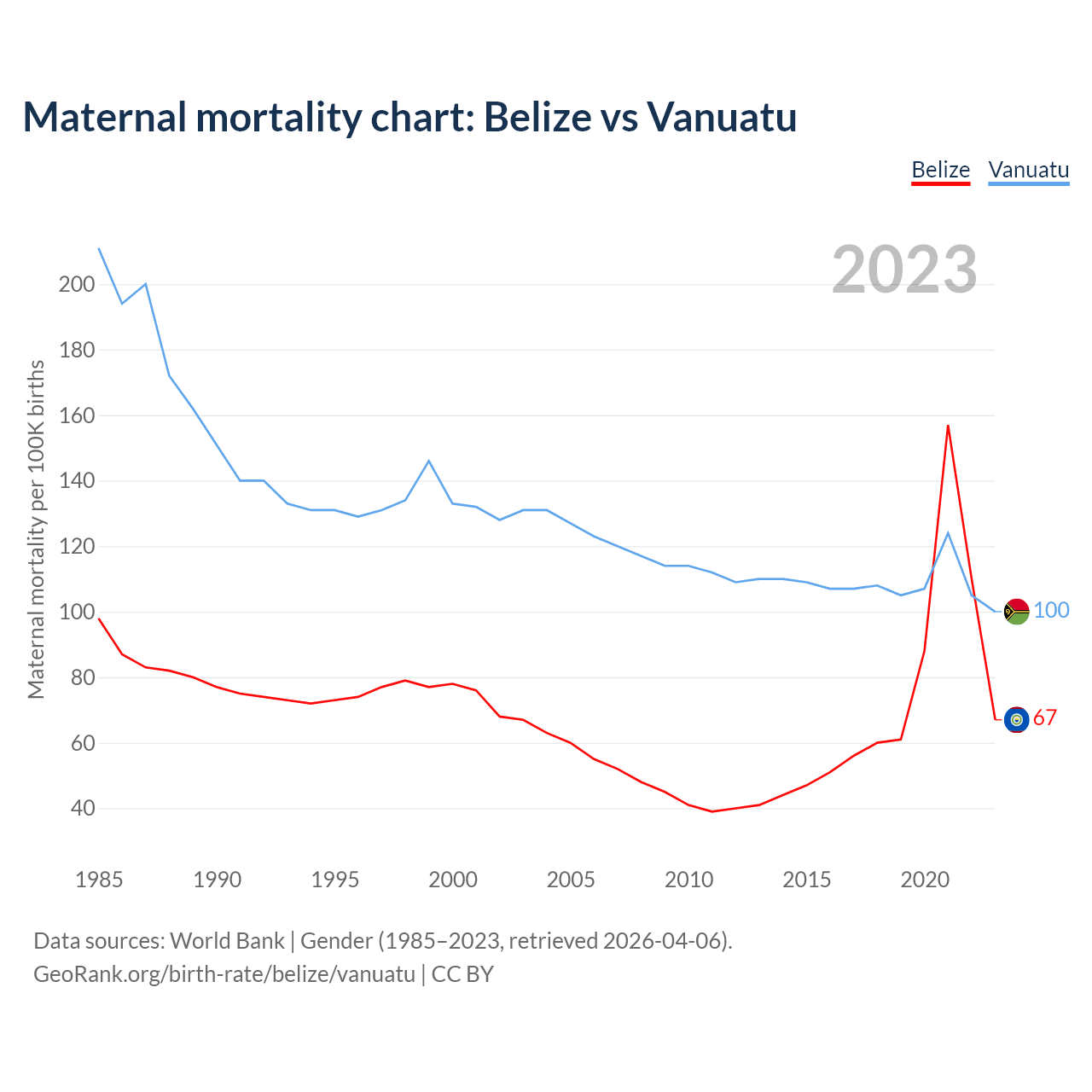 The maternal mortality rate, which is the probability of dying during childbirth or within 42 days of pregnancy termination, is 67 deaths per 100,000 live births in Belize, compared to 100 deaths in Vanuatu.