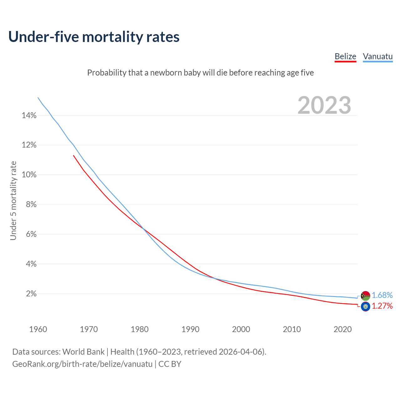 The chance that a newborn baby will die before reaching age five is 1.27% in Belize and 1.68% in Vanuatu. Above is a chart with historical data on under-five mortality rates.