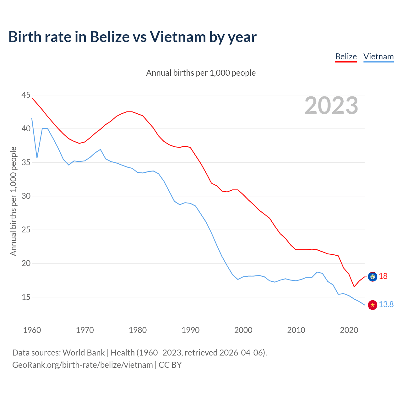 Belize has an annual birth rate of 18 births per 1,000 people, compared to 13.8 for Vietnam. The average number of children a woman is expected to have during her lifetime — the fertility rate, is 2.01 in Belize and 1.91 in Vietnam — 4.68% difference.