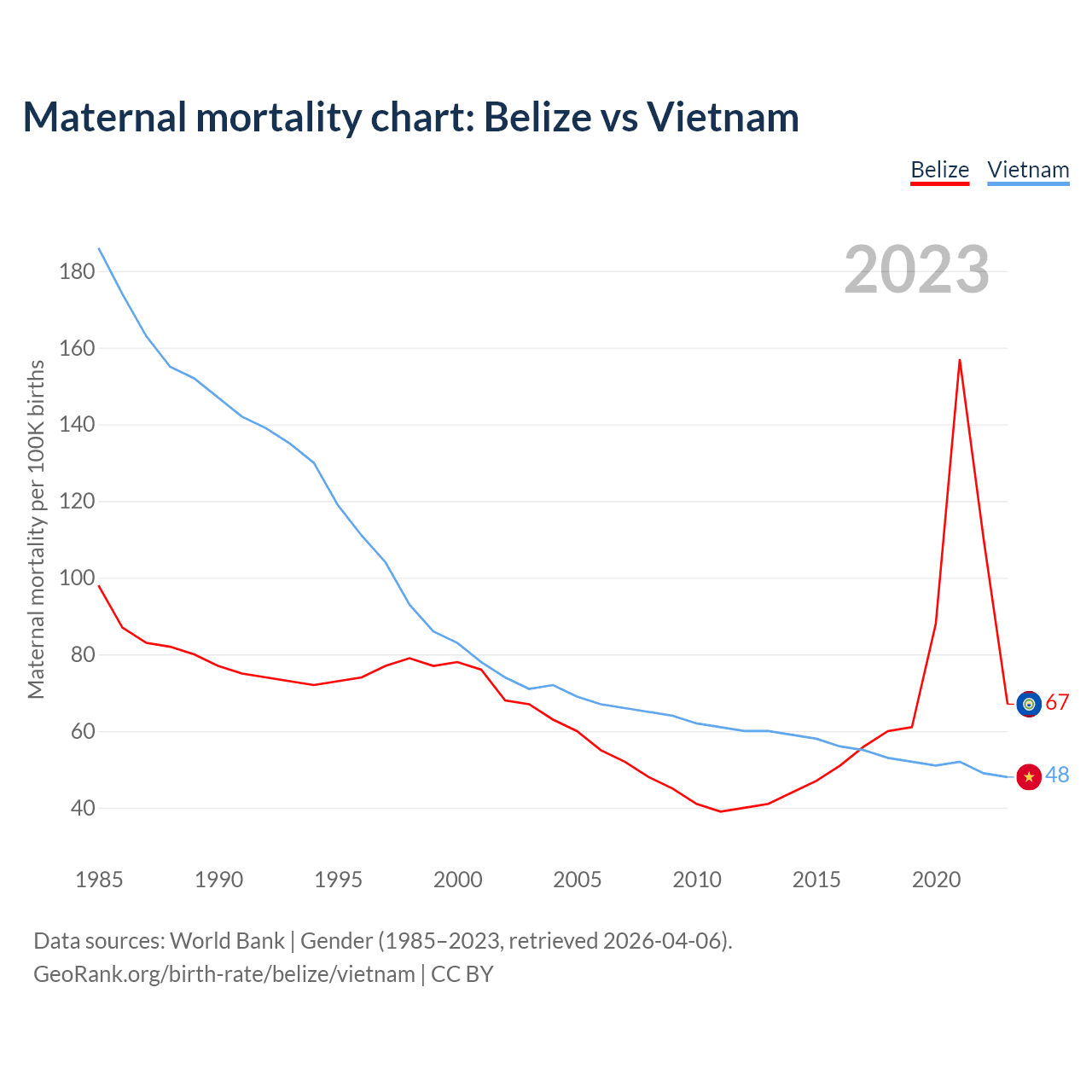 The maternal mortality rate, which is the probability of dying during childbirth or within 42 days of pregnancy termination, is 67 deaths per 100,000 live births in Belize, compared to 48 deaths in Vietnam.