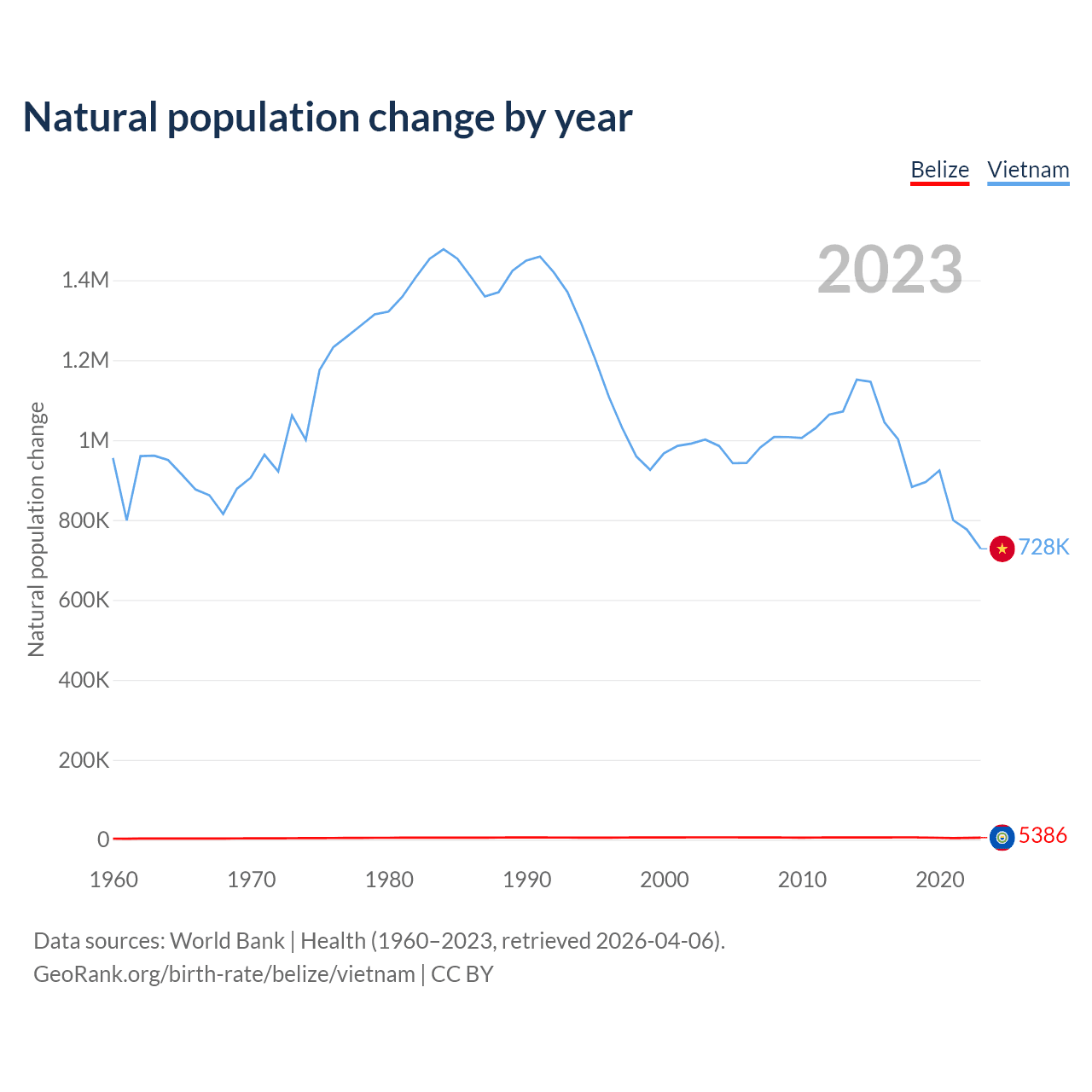 According to the latest available data on birth rates, the fertility rate in Belize was 2.01 children per woman in 2023, compared to 1.91 in Vietnam in 2023. The replacement level is considered to be 2.1 children per woman.