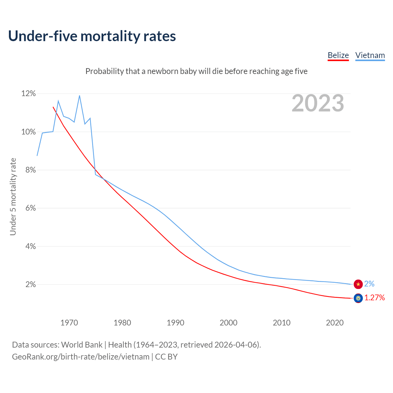 The chance that a newborn baby will die before reaching age five is 1.27% in Belize and 2% in Vietnam. Above is a chart with historical data on under-five mortality rates.