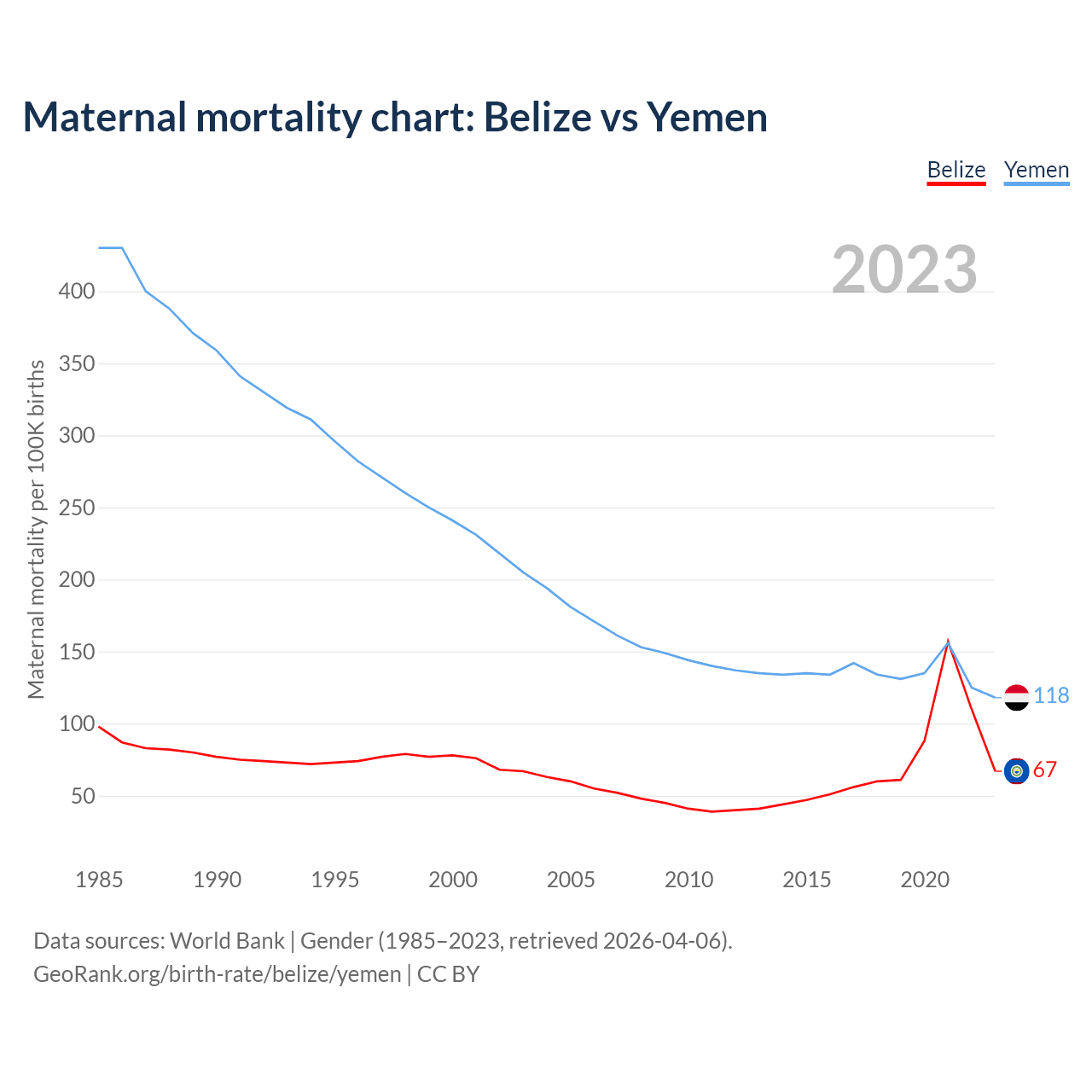 The maternal mortality rate, which is the probability of dying during childbirth or within 42 days of pregnancy termination, is 67 deaths per 100,000 live births in Belize, compared to 118 deaths in Yemen.