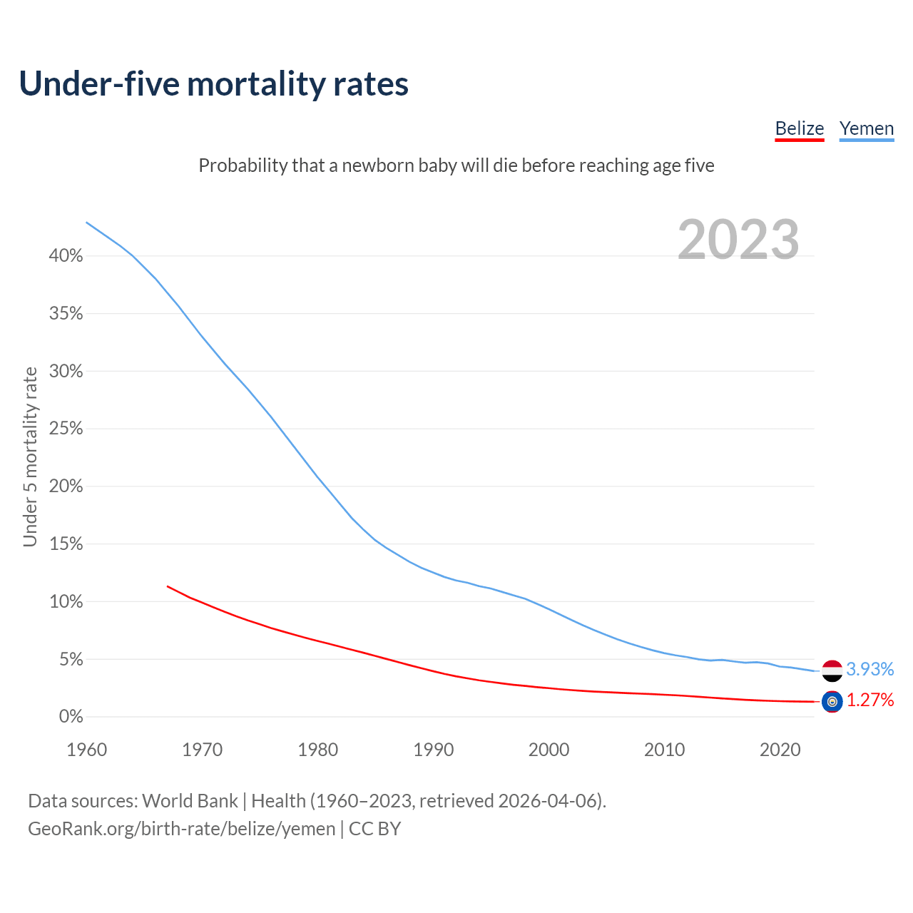 The chance that a newborn baby will die before reaching age five is 1.27% in Belize and 3.93% in Yemen. Above is a chart with historical data on under-five mortality rates.
