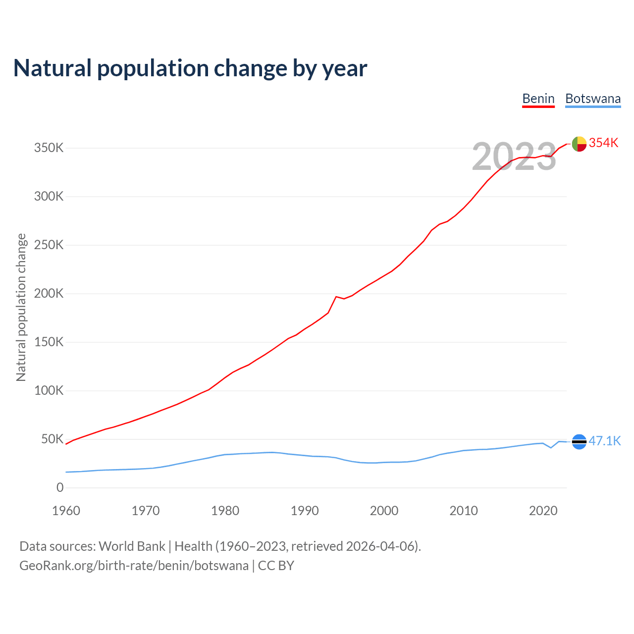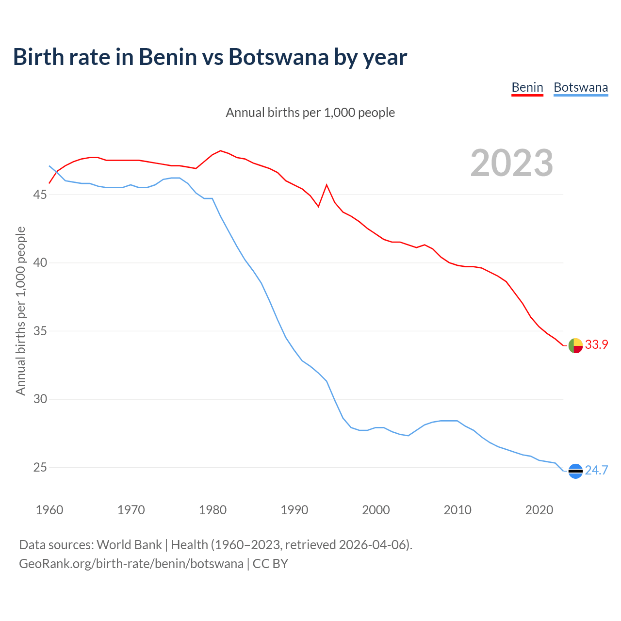 Benin has an annual birth rate of 33.9 births per 1,000 people, compared to 24.7 for Botswana. The average number of children a woman is expected to have during her lifetime — the fertility rate, is 4.56 in Benin and 2.73 in Botswana — 40% difference.