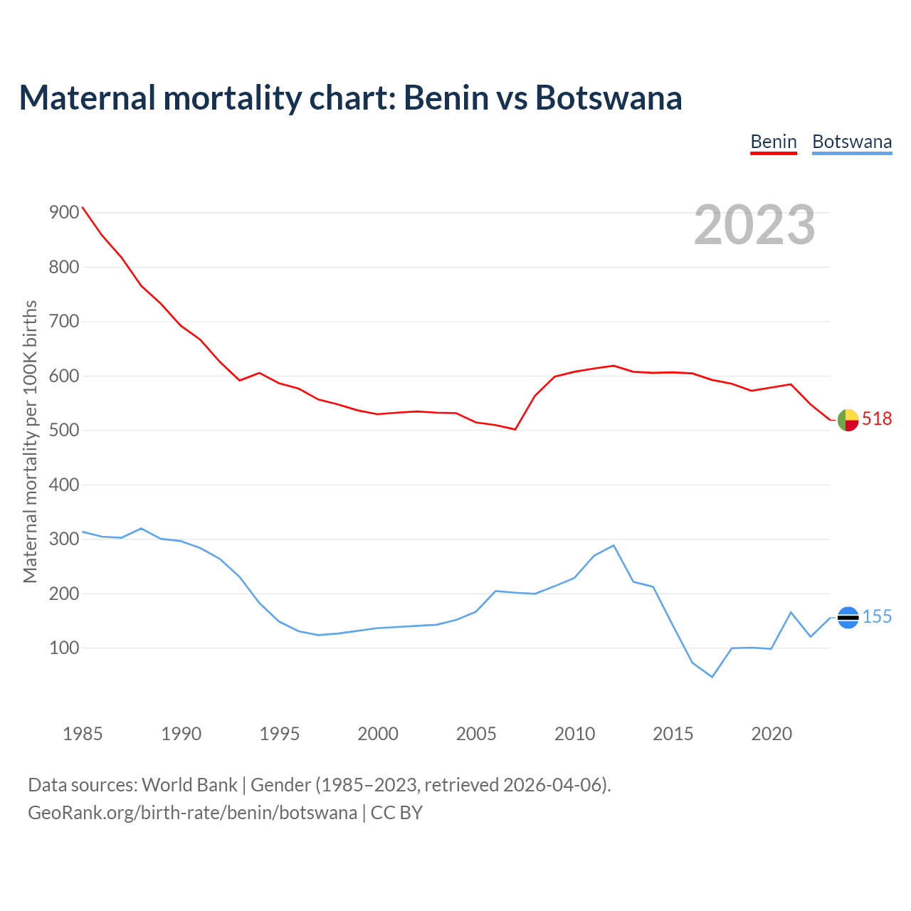 The maternal mortality rate, which is the probability of dying during childbirth or within 42 days of pregnancy termination, is 518 deaths per 100,000 live births in Benin, compared to 155 deaths in Botswana.