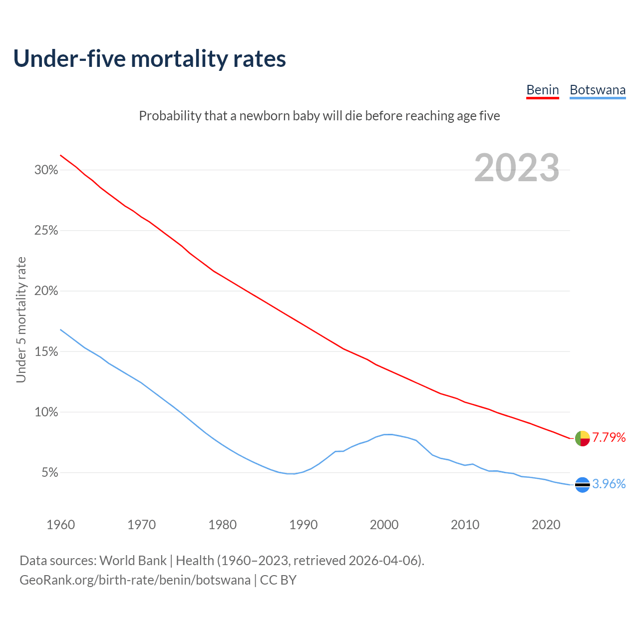 The chance that a newborn baby will die before reaching age five is 7.79% in Benin and 3.96% in Botswana. Above is a chart with historical data on under-five mortality rates.