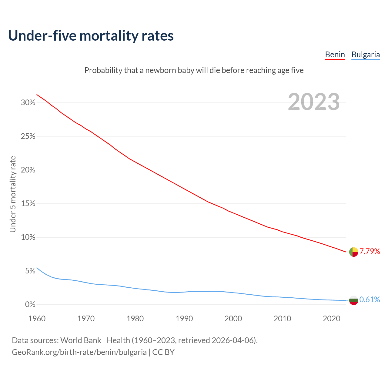 The chance that a newborn baby will die before reaching age five is 7.79% in Benin and 0.61% in Bulgaria. Above is a chart with historical data on under-five mortality rates.