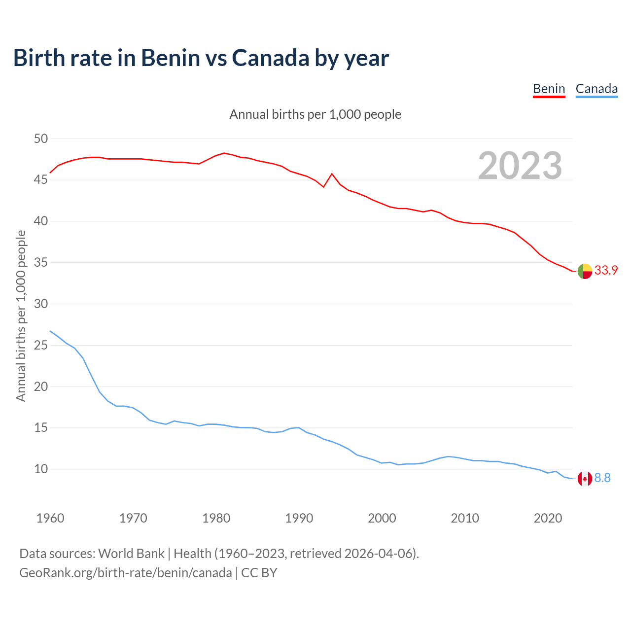 Benin has an annual birth rate of 33.9 births per 1,000 people, compared to 8.8 for Canada. The average number of children a woman is expected to have during her lifetime — the fertility rate, is 4.56 in Benin and 1.26 in Canada — 72.3% difference.