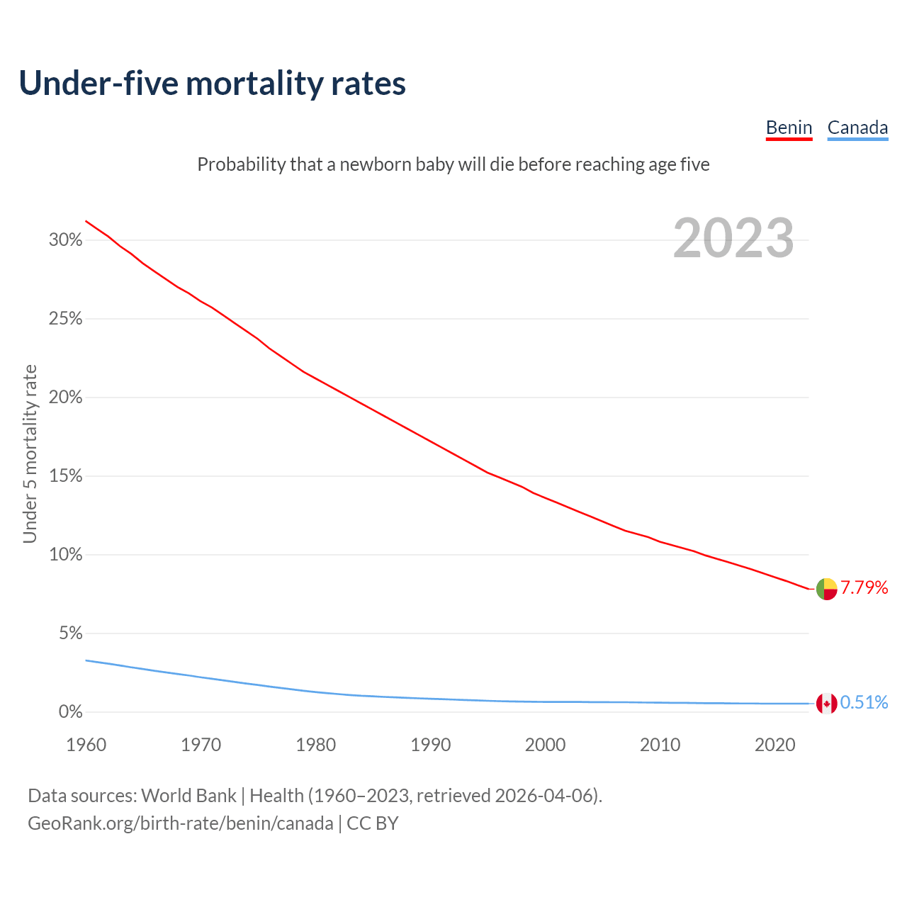 The chance that a newborn baby will die before reaching age five is 7.79% in Benin and 0.51% in Canada. Above is a chart with historical data on under-five mortality rates.