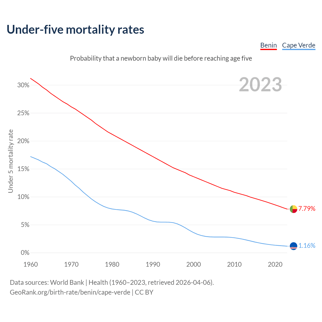 The chance that a newborn baby will die before reaching age five is 7.79% in Benin and 1.16% in Cape Verde. Above is a chart with historical data on under-five mortality rates.