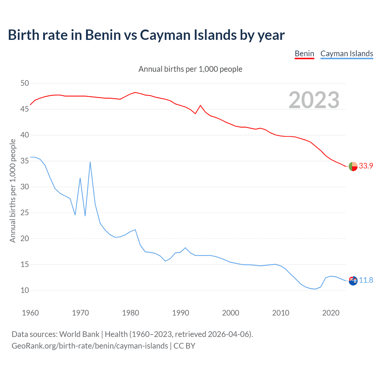 Benin has an annual birth rate of 33.9 births per 1,000 people, compared to 11.8 for the Cayman Islands. The average number of children a woman is expected to have during her lifetime — the fertility rate, is 4.56 in Benin and 1.53 in the Cayman Islands — 66.4% difference.