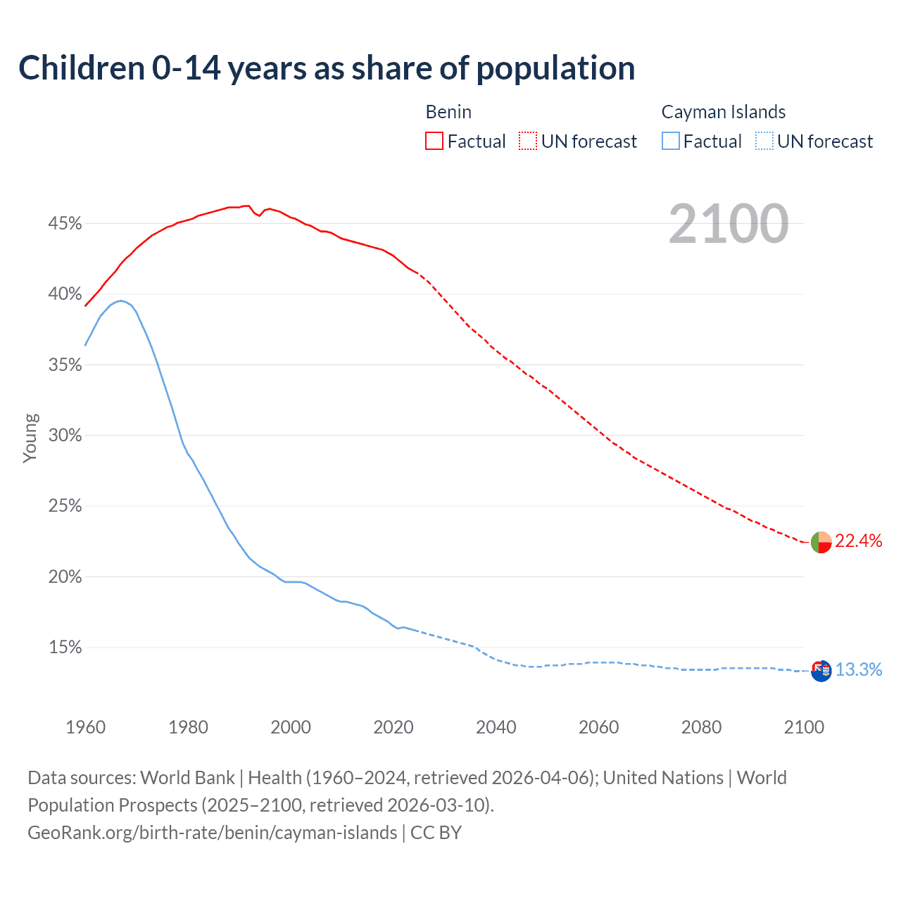 Children aged 0-14 make up 41.6% of the population in Benin and 16.2% in the Cayman Islands in 2024, compared to 46.1% and 22.3% respectively in 1990.