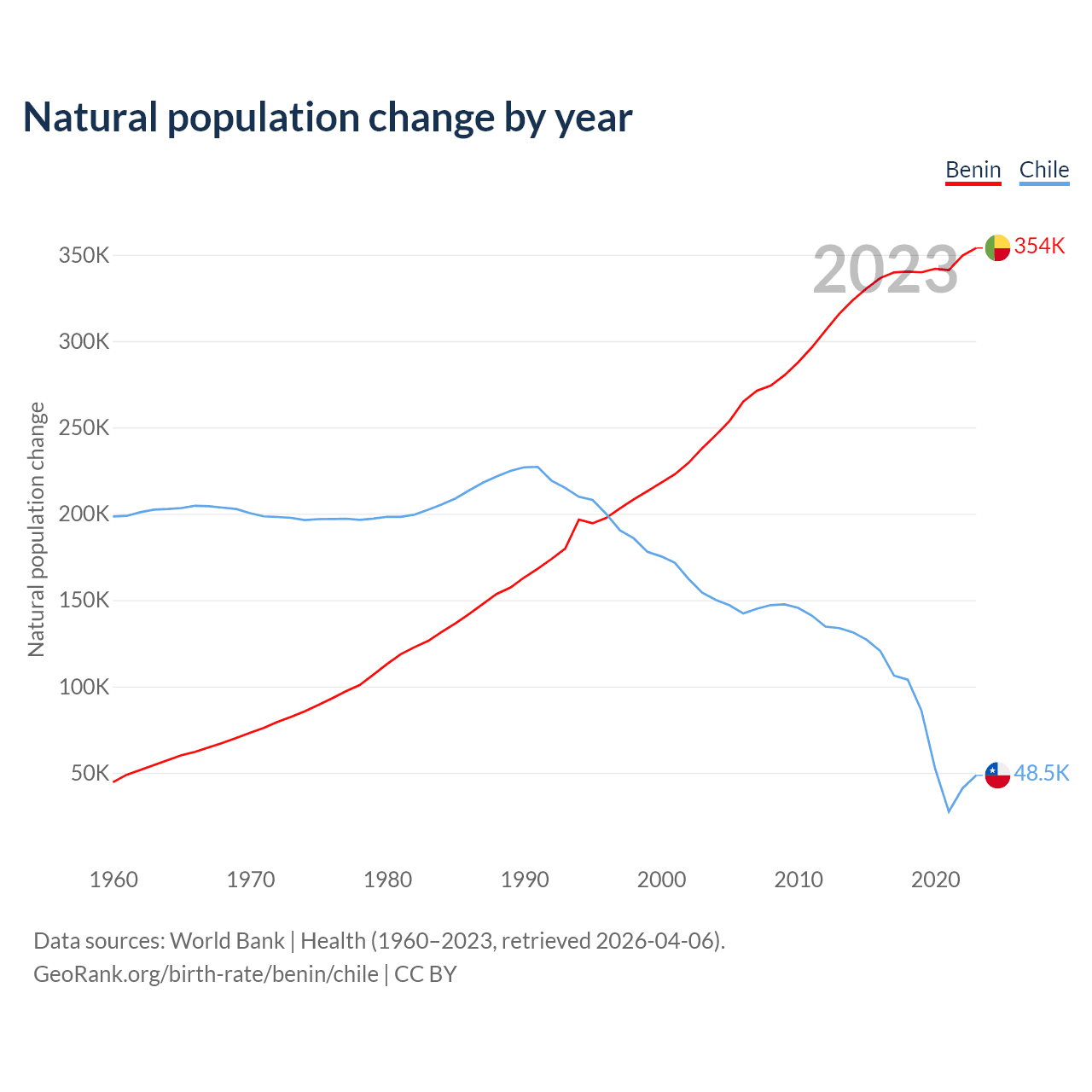 Benin has an annual birth rate of 33.9 births per 1,000 people, compared to 8.96 for Chile. The average number of children a woman is expected to have during her lifetime — the fertility rate, is 4.56 in Benin and 1.17 in Chile — 74.4% difference.
