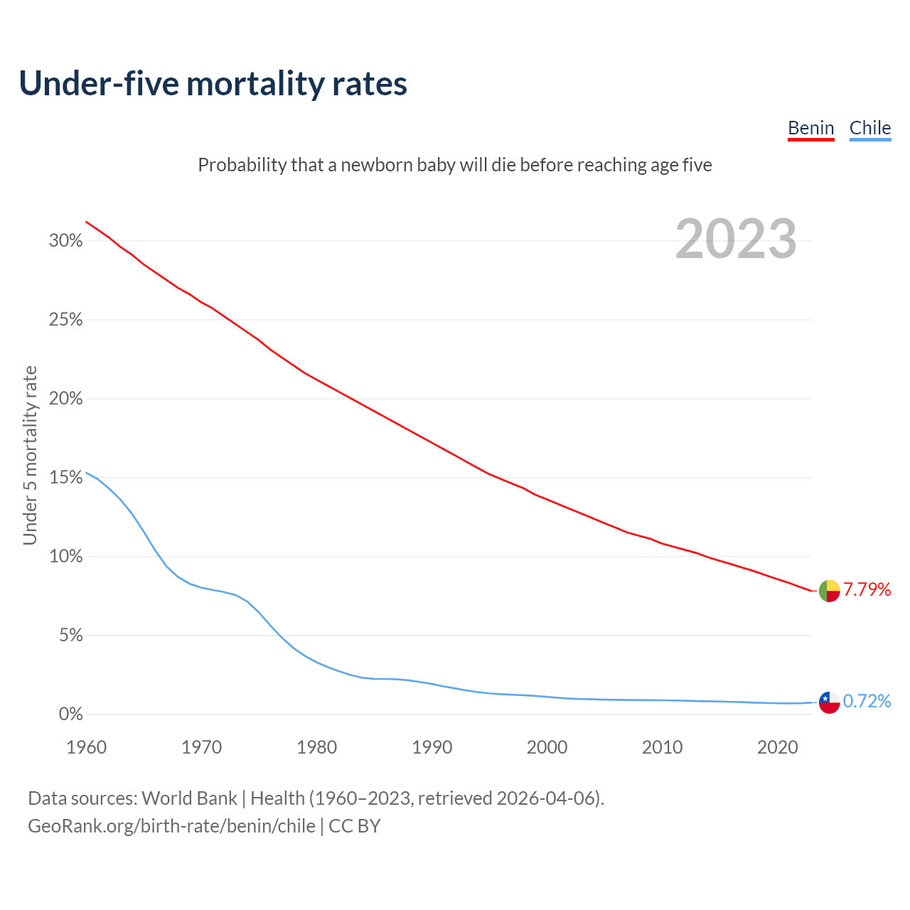 The chance that a newborn baby will die before reaching age five is 7.79% in Benin and 0.72% in Chile. Above is a chart with historical data on under-five mortality rates.