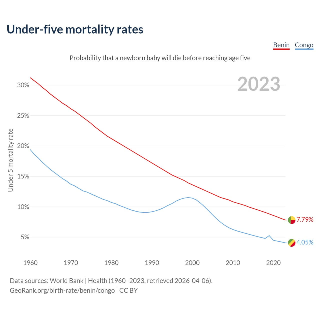 The chance that a newborn baby will die before reaching age five is 7.79% in Benin and 4.05% in the Congo. Above is a chart with historical data on under-five mortality rates.