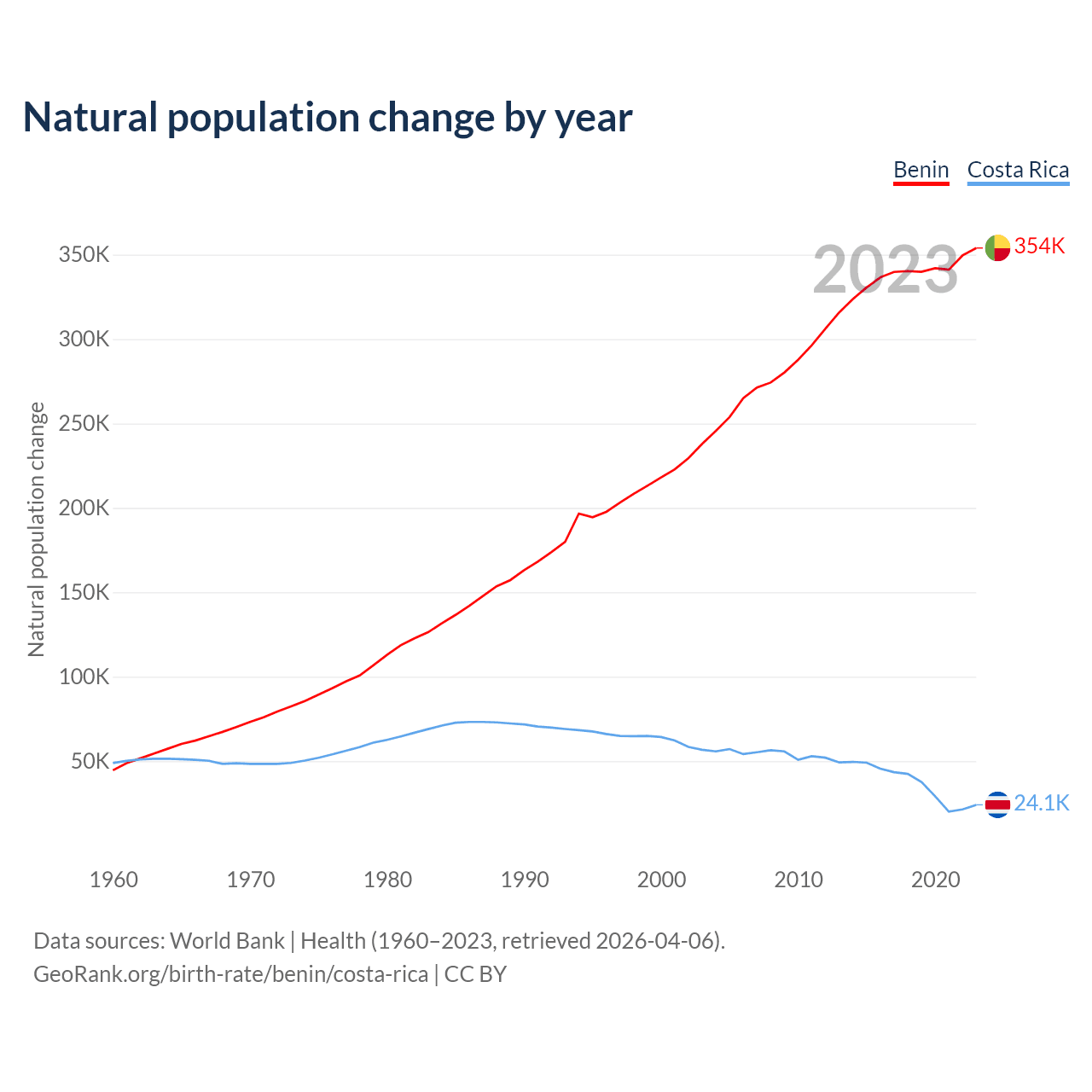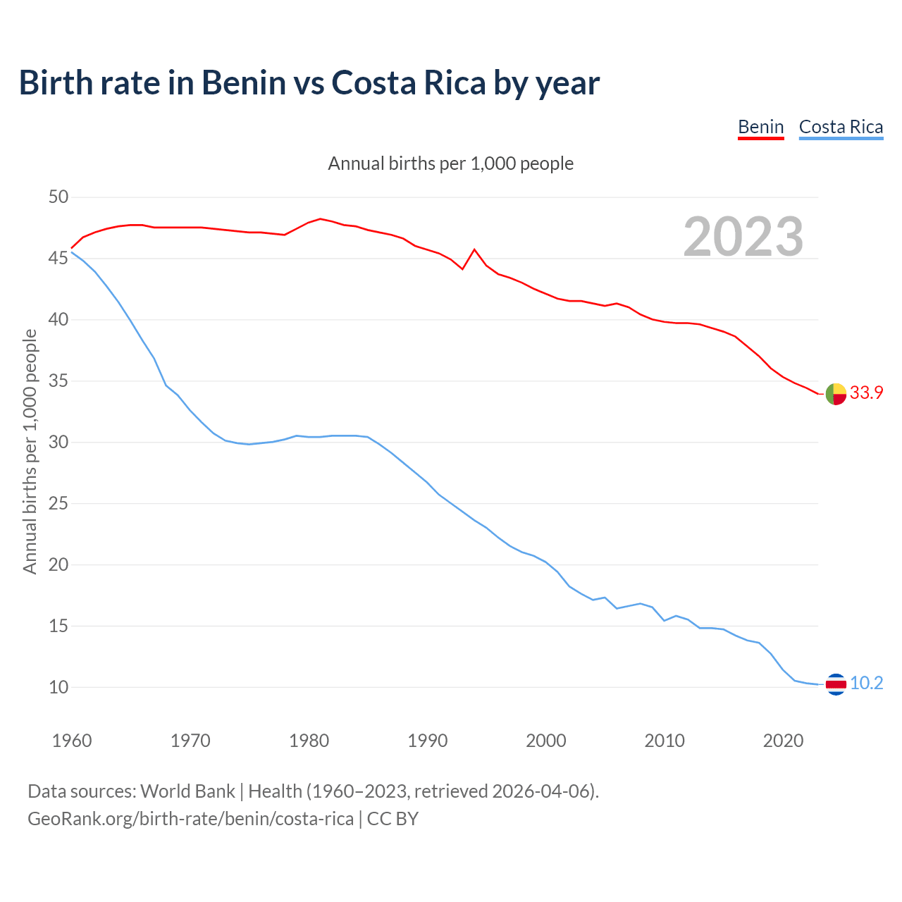 Benin has an annual birth rate of 33.9 births per 1,000 people, compared to 10.2 for Costa Rica. The average number of children a woman is expected to have during her lifetime — the fertility rate, is 4.56 in Benin and 1.33 in Costa Rica — 70.8% difference.