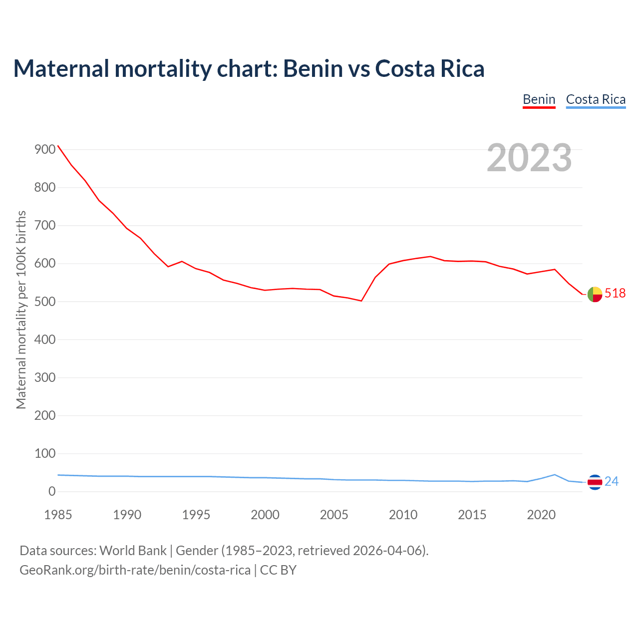 The maternal mortality rate, which is the probability of dying during childbirth or within 42 days of pregnancy termination, is 518 deaths per 100,000 live births in Benin, compared to 24 deaths in Costa Rica.