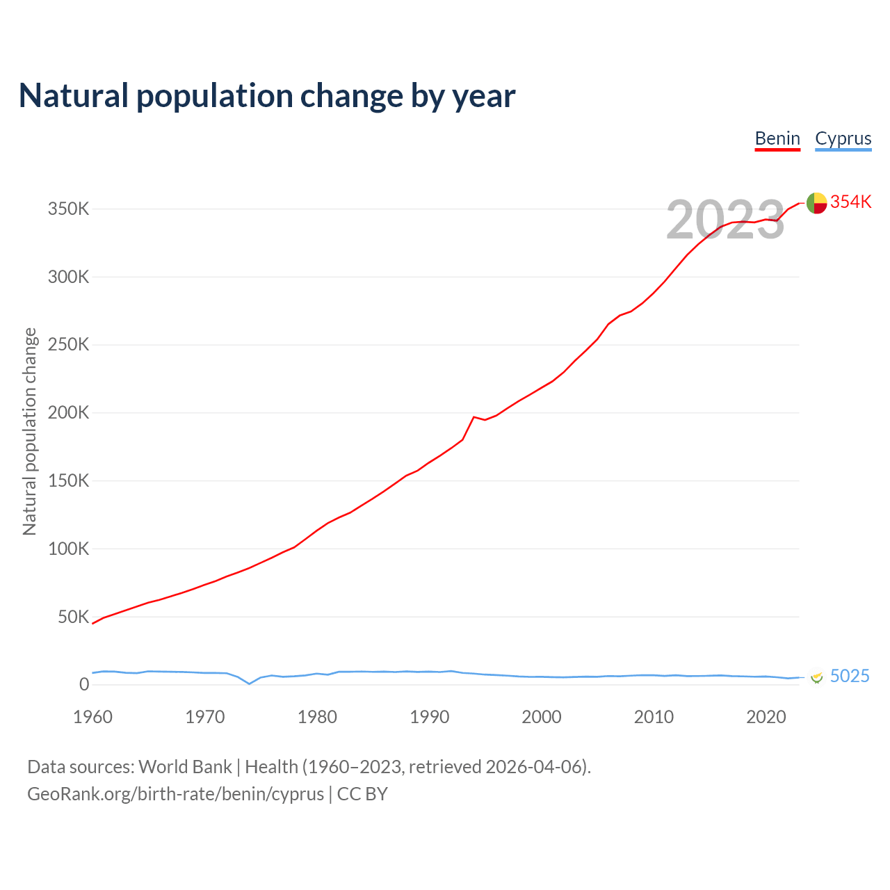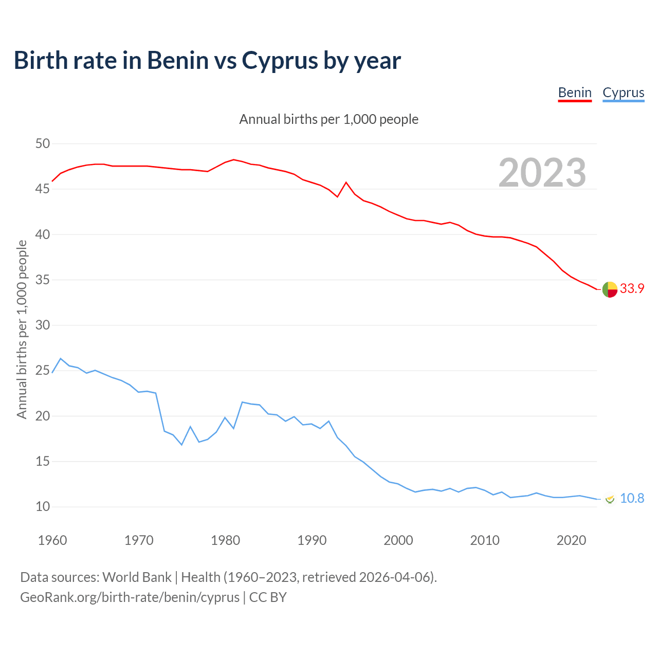 Benin has an annual birth rate of 33.9 births per 1,000 people, compared to 10.8 for Cyprus. The average number of children a woman is expected to have during her lifetime — the fertility rate, is 4.56 in Benin and 1.39 in Cyprus — 69.5% difference.