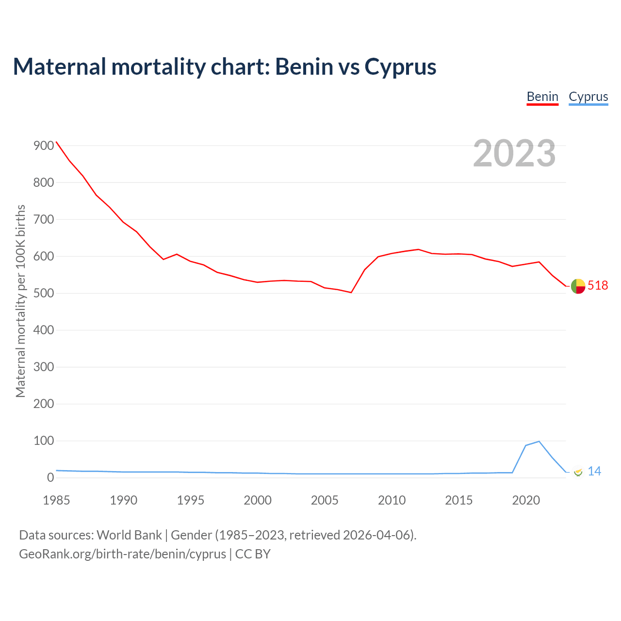 The maternal mortality rate, which is the probability of dying during childbirth or within 42 days of pregnancy termination, is 518 deaths per 100,000 live births in Benin, compared to 14 deaths in Cyprus.