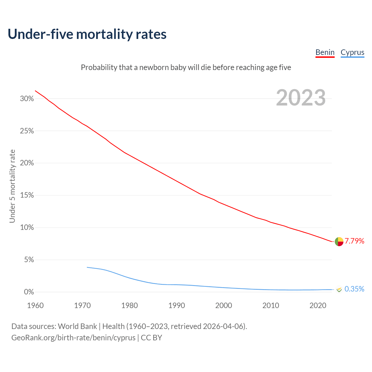 The chance that a newborn baby will die before reaching age five is 7.79% in Benin and 0.35% in Cyprus. Above is a chart with historical data on under-five mortality rates.