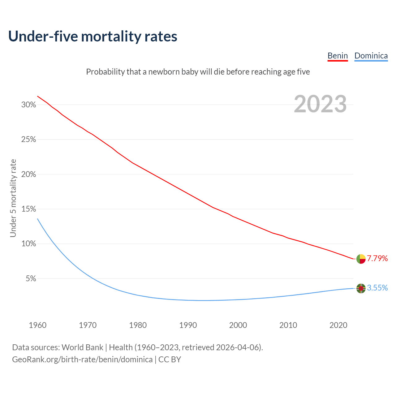 The chance that a newborn baby will die before reaching age five is 7.79% in Benin and 3.55% in Dominica. Above is a chart with historical data on under-five mortality rates.