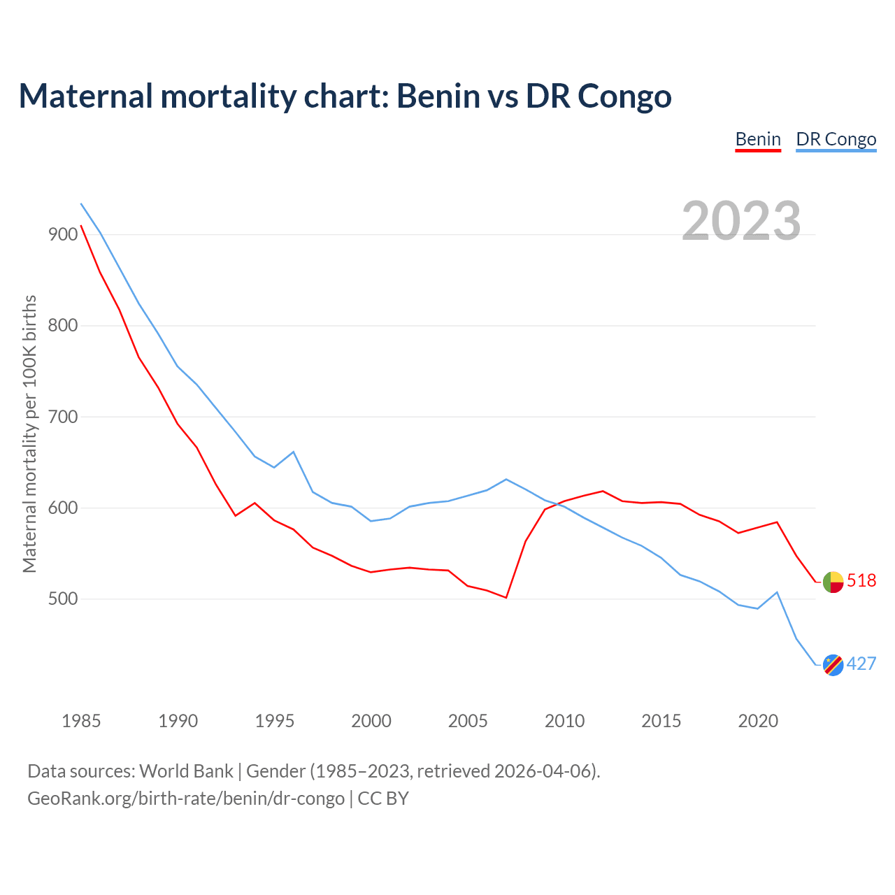 The maternal mortality rate, which is the probability of dying during childbirth or within 42 days of pregnancy termination, is 518 deaths per 100,000 live births in Benin, compared to 427 deaths in the DR Congo.