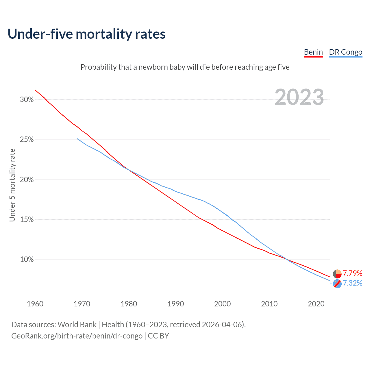 The chance that a newborn baby will die before reaching age five is 7.79% in Benin and 7.32% in the DR Congo. Above is a chart with historical data on under-five mortality rates.