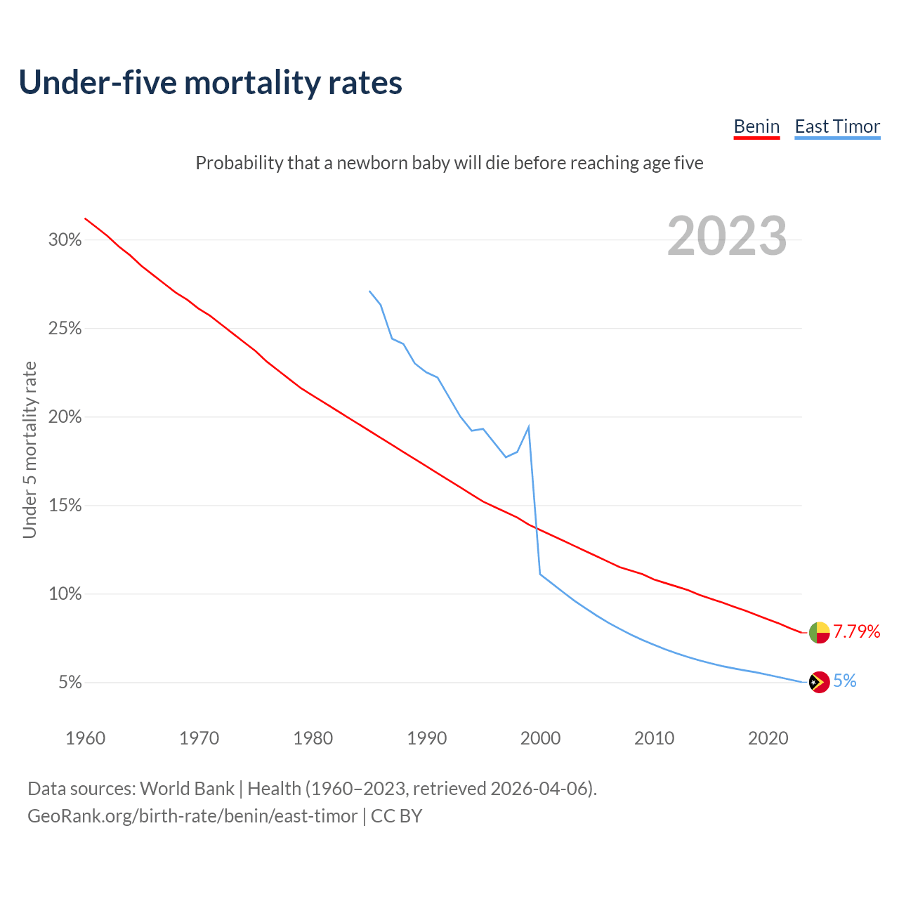 The chance that a newborn baby will die before reaching age five is 7.79% in Benin and 5% in East Timor. Above is a chart with historical data on under-five mortality rates.