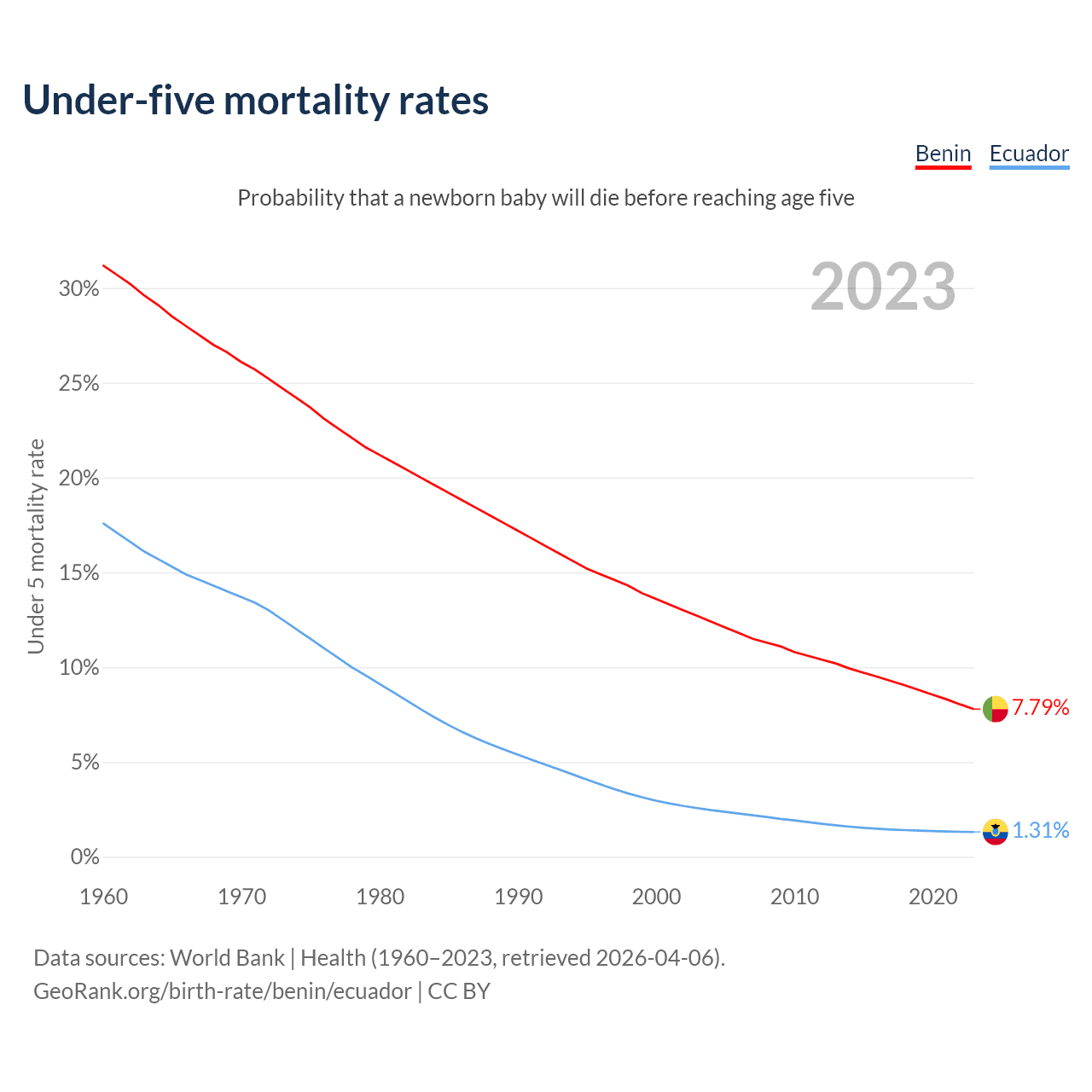 The chance that a newborn baby will die before reaching age five is 7.79% in Benin and 1.31% in Ecuador. Above is a chart with historical data on under-five mortality rates.