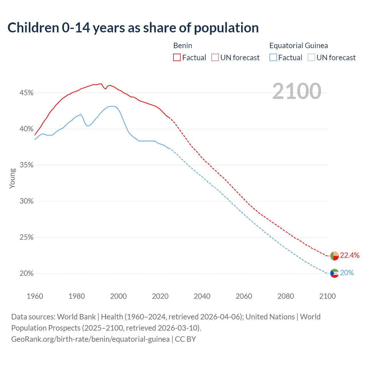 According to the latest available data on birth rates, the fertility rate in Benin was 4.56 children per woman in 2023, compared to 4.08 in Equatorial Guinea in 2023. The replacement level is considered to be 2.1 children per woman.
