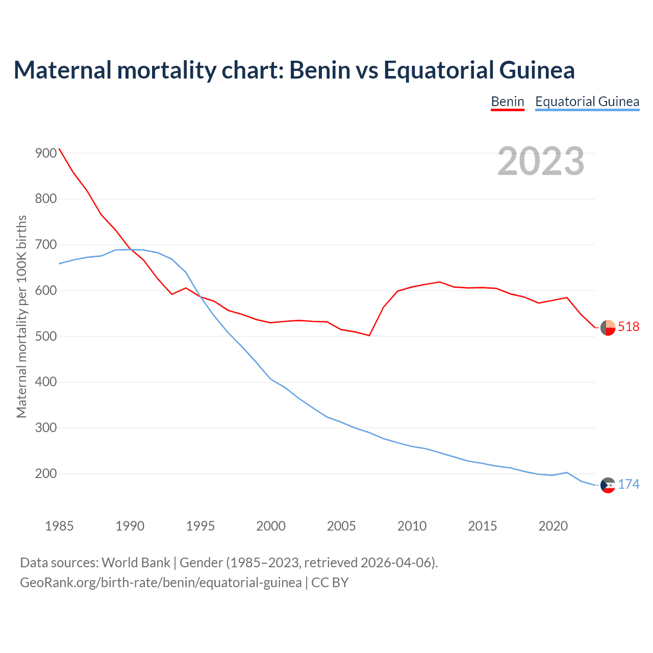 The maternal mortality rate, which is the probability of dying during childbirth or within 42 days of pregnancy termination, is 518 deaths per 100,000 live births in Benin, compared to 174 deaths in Equatorial Guinea.
