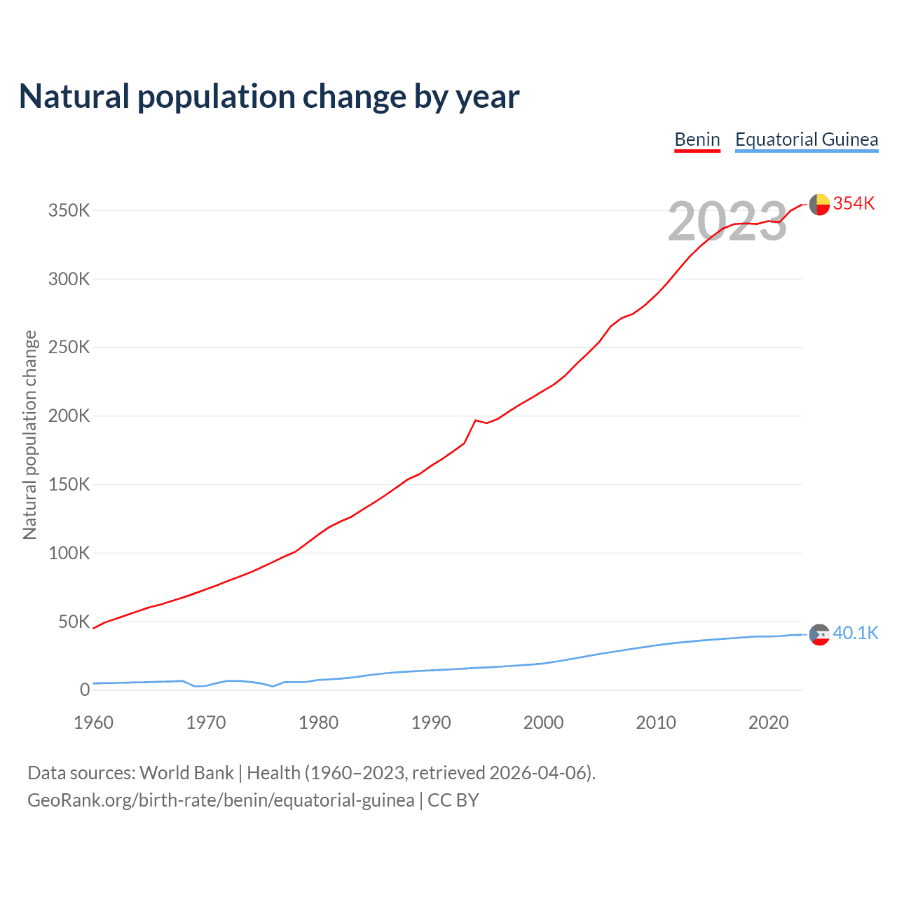 Benin has an annual birth rate of 33.9 births per 1,000 people, compared to 29.6 for Equatorial Guinea. The average number of children a woman is expected to have during her lifetime — the fertility rate, is 4.56 in Benin and 4.08 in Equatorial Guinea — 10.4% difference.